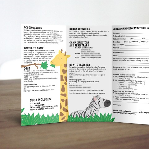 Designed for Junior Camp, a week long kids holiday program run by the Fellowship of Congregational Churches, this camp flyer aimed to generate interest around the theme of the week away: Jesus King of the Jungle. The animals illustrated for the flyer were able to be re-used for additional collateral on camp such as study booklets and more.