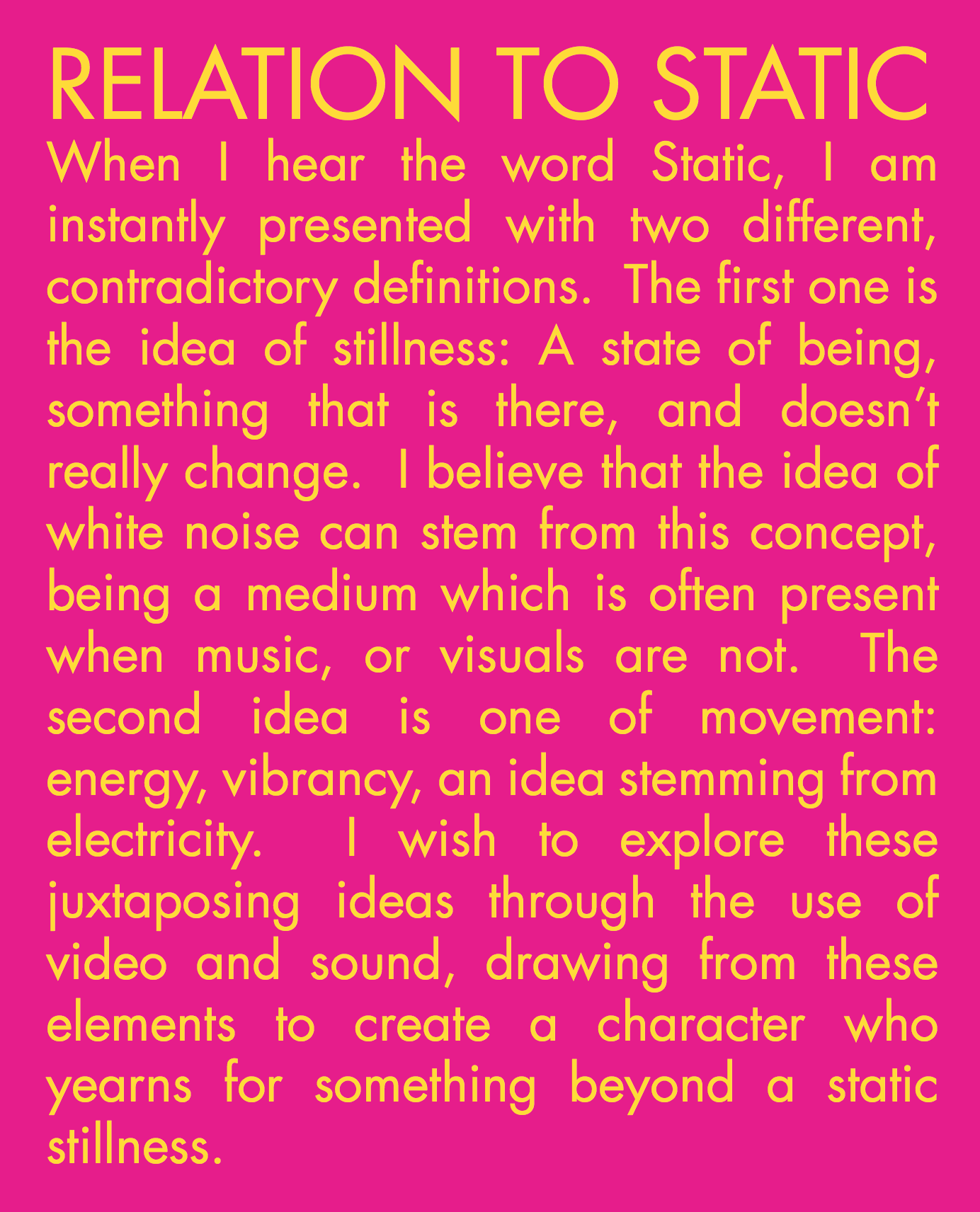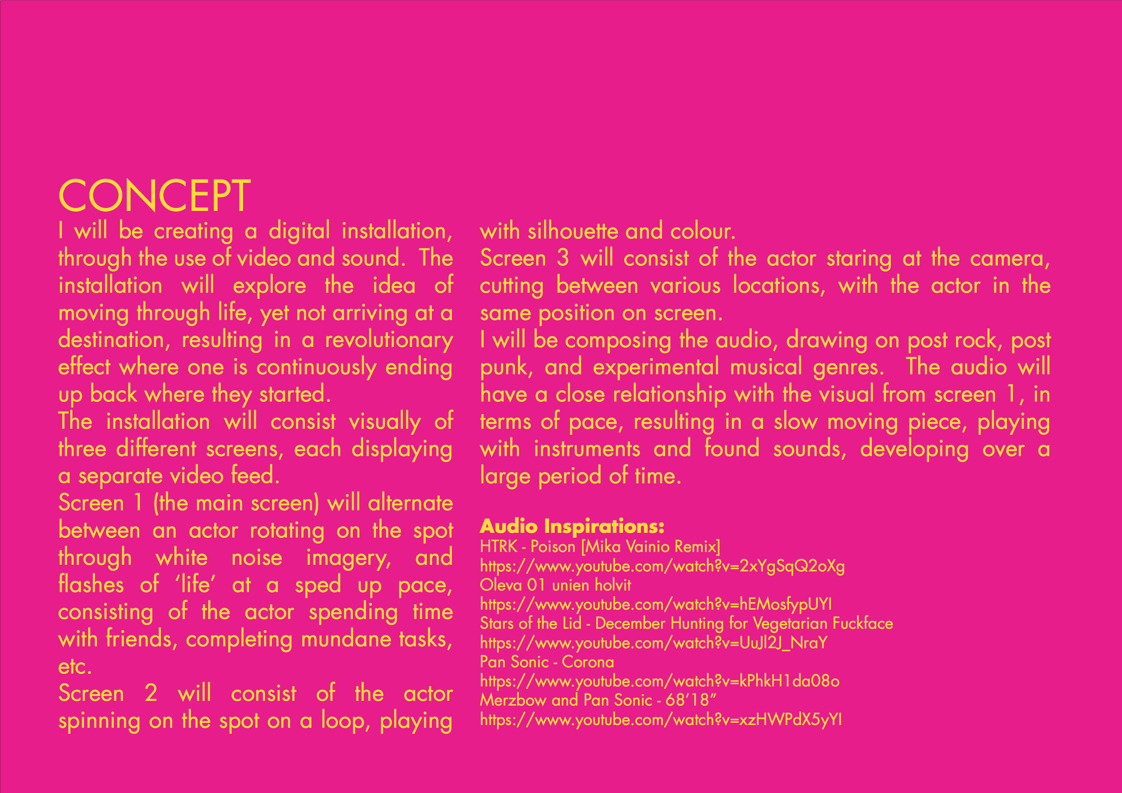 Self motivated project for the exhibition Nothing To See Here 2015 held at the University of Wollongong. The exhibition theme was static, and participants were called to create a work which reflected the theme in some way. I submitted a Digital Installation consisting of three video feeds directed, filmed, and edited by myself, as well as a composition written in sibelius, and recorded via MIDI manipulation and live instrument recording techniques. The piece, titled revolution, focused on the cyclical effect life has – we go about our lives completing tasks, attempting to move forward in our context, however in the end, we do not go anywhere. “For dust you are and to dust you will return.” Genesis 3:19b. Although we are here, now, our lives are fairly static. That is not to say that our lives are meaningless, but instead that we must take note of the simple things while we still can.