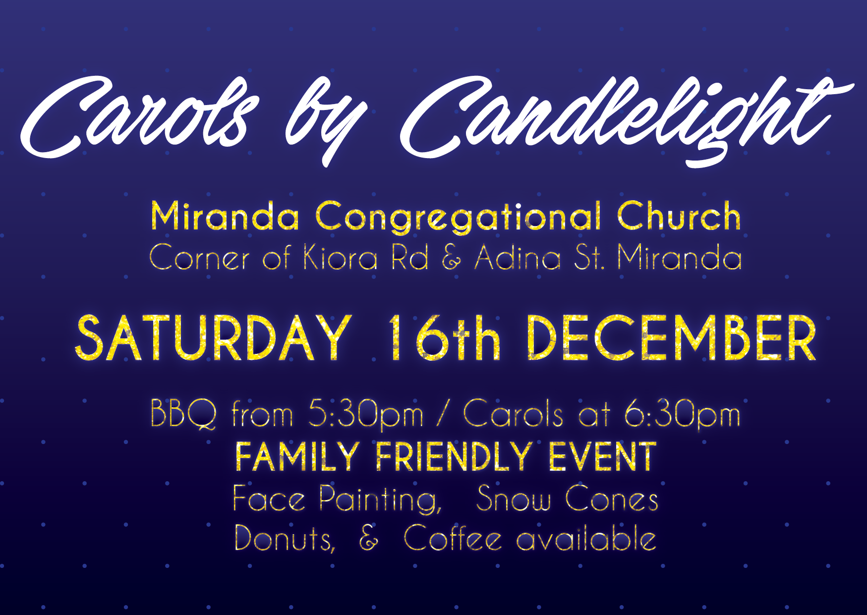 This was the first carols event planned and co-ordinated at Miranda Congregational church, and the aim of the night was simple: welcome new people using the familiarity of Christmas, and sharing festivities through song, in order to create a connection and share the Good News about Jesus. A key element to this event involved ensuring that the message was accessible to people of all ages, and ensuring we had elements in the service which catered specifically to the younger children who also took part in the service singing a few songs for the congregation.